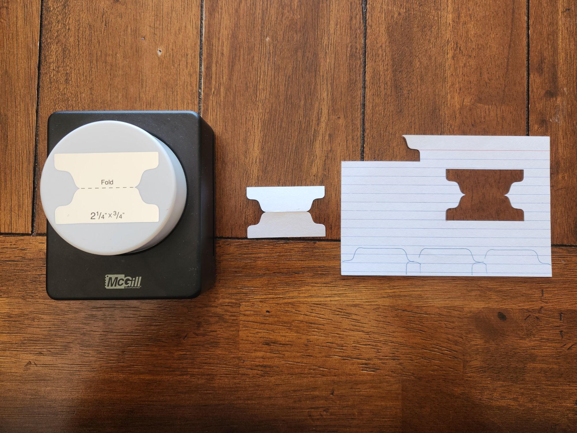 A square black plastic punch with a white circular button sits on a wooden table next to an index card with a tab shaped hole punched out of it.