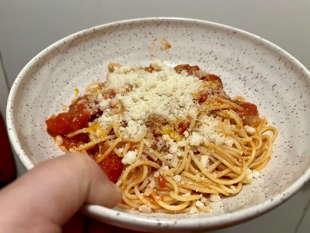 Sometimes you just need a big bowl of pasta with a ton of fresh parmesan. Tomatoes, garlic, onion, olive oil, chilies.